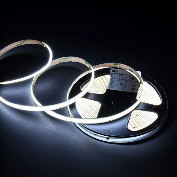Светодиодная лента IEK с технологией COB (Chip On Board) и плотностью 480 светодиодов на метр предназначена для создания качественного и равномерного освещения. Она идеально подходит для декоративной подсветки мебели, ниш, барных стоек, витрин, оконных проемов, а также для оформления элементов интерьера — многоуровневых и подвесных потолков, карнизов, плинтусов и архитектурных деталей.