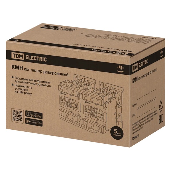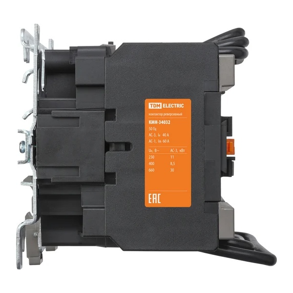 Реверсивный контактор TDM предназначен для пуска, остановки и изменения направления вращения асинхронных электродвигателей переменного тока. Управление осуществляется от цепи управления с номинальным напряжением 230 В AC. Устройство рассчитано на работу в категории применения AC-3, что обеспечивает надёжную коммутацию нагрузок при пусковых токах, характерных для электродвигателей.