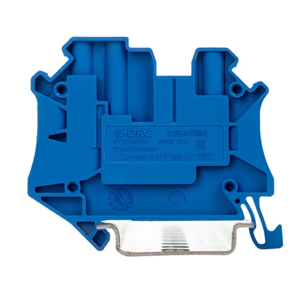 Синяя проходная винтовая клемма на DIN Рейку для проводников сечением до 4мм2, один уровень 3 контакта, ДКС TUR-4-TWIN-BU