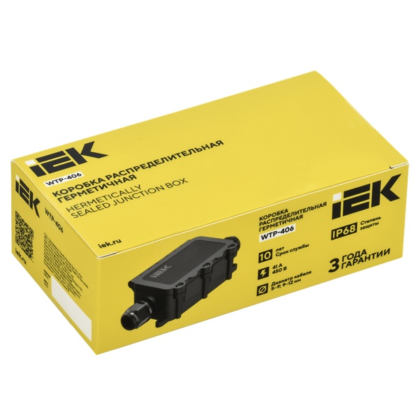 Коробка выполнена в герметичном исполнении с классом защиты IP68, что обеспечивает полную пыленепроницаемость и устойчивость к длительному воздействию влаги. Подходит для монтажа на открытых поверхностях.