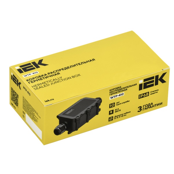 Коробка выполнена в герметичном исполнении с классом защиты IP68, что обеспечивает полную пыленепроницаемость и устойчивость к длительному воздействию влаги. Подходит для монтажа на открытых поверхностях.