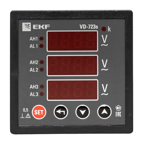 VD-723s Вольтметр цифровой на панель EKF трехфазный 30-500В АС 0,5 в коротком корпусе 72х72х65мм фото 1