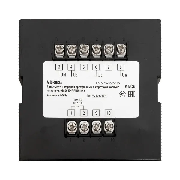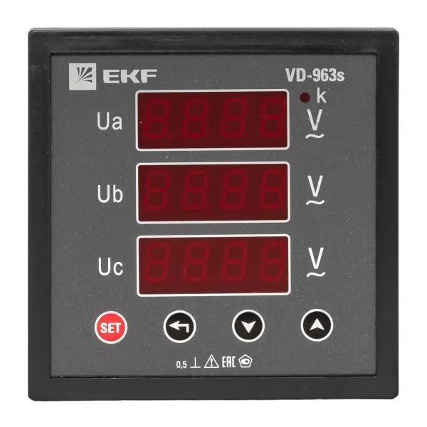 Цифровой трехфазный измеритель напряжения до 500В для щитового оборудования 96х96 EKF VD-963s