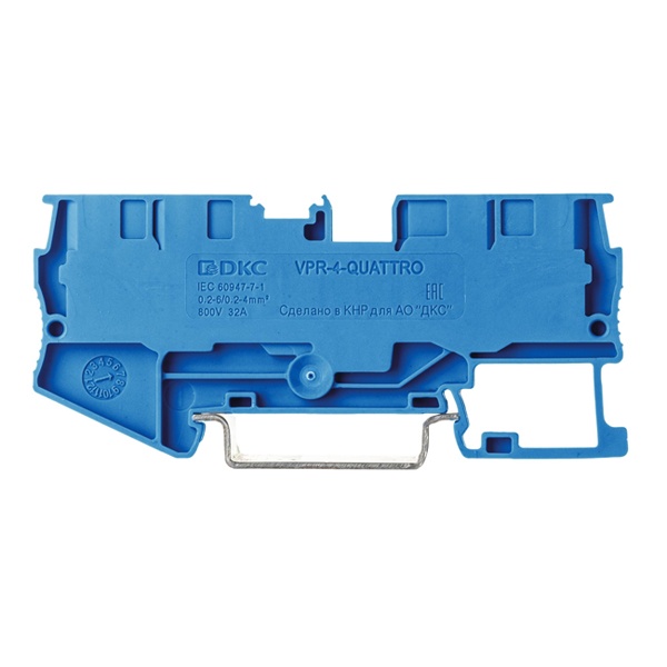 Синяя проходная самозажимная клемма на DIN Рейку для проводников сечением до 4мм2, один уровень 4 контакта, ДКС VPR-4-QUATTRO-BU