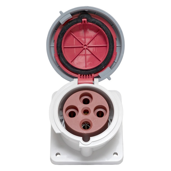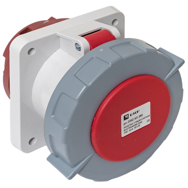 Влагозащищенная панельная встраиваемая силовая трехфазная розетка красного цвета с прямым подключением, 4 контакта, 400 Вольт 63А, Екф. ps-3342-63-380