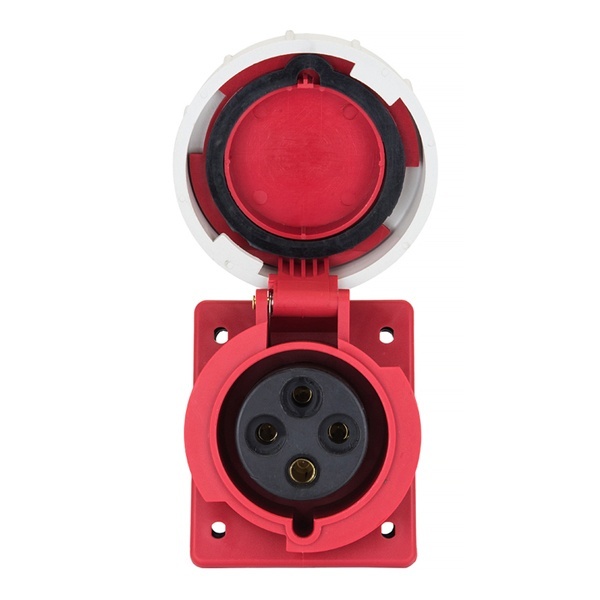 Влагозащищенная встраиваемая панельная силовая трехфазная розетка красного цвета с подключением под углом, 4 контакта, 400 Вольт 32А, Екф. ps-4242-32-380