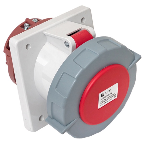 Влагозащищенная встраиваемая панельная силовая трехфазная розетка красного цвета с подключением под углом, 5 контактов, 400 Вольт 63А, Екф. ps-4352-63-380