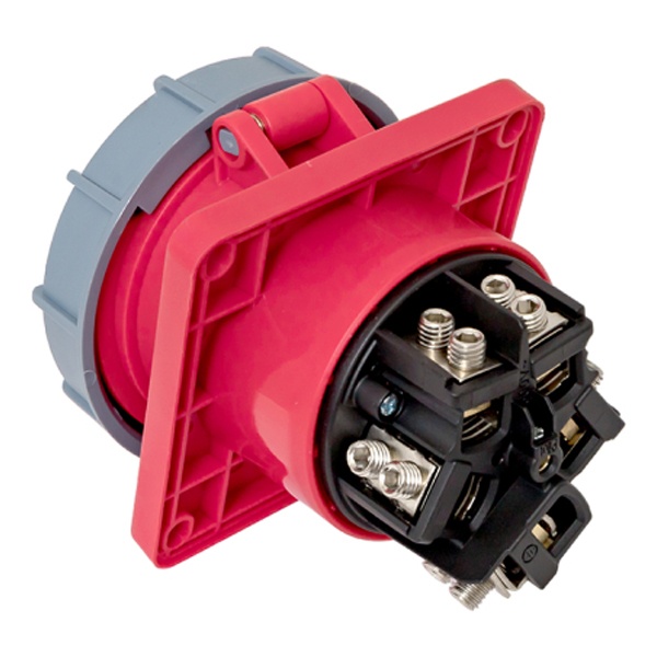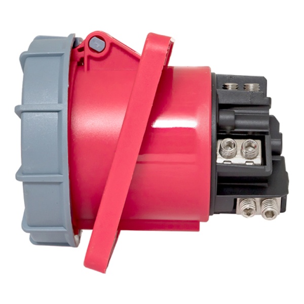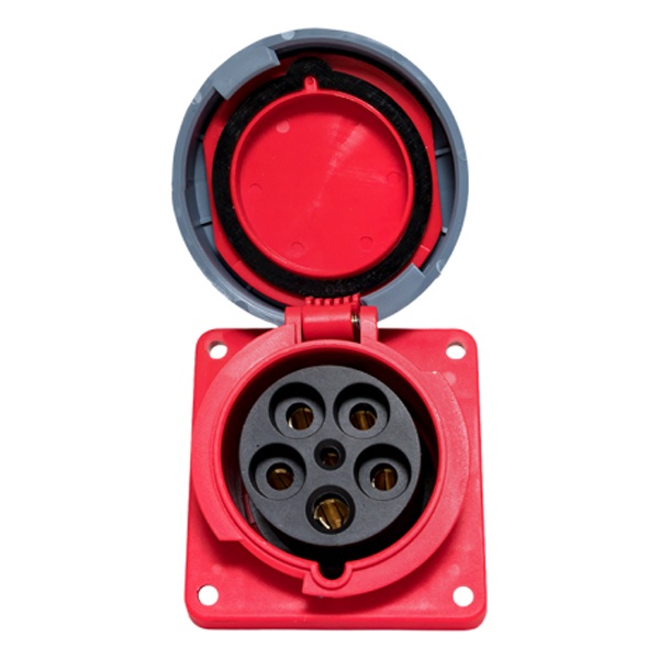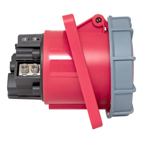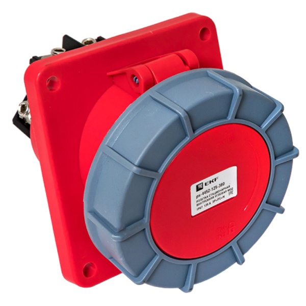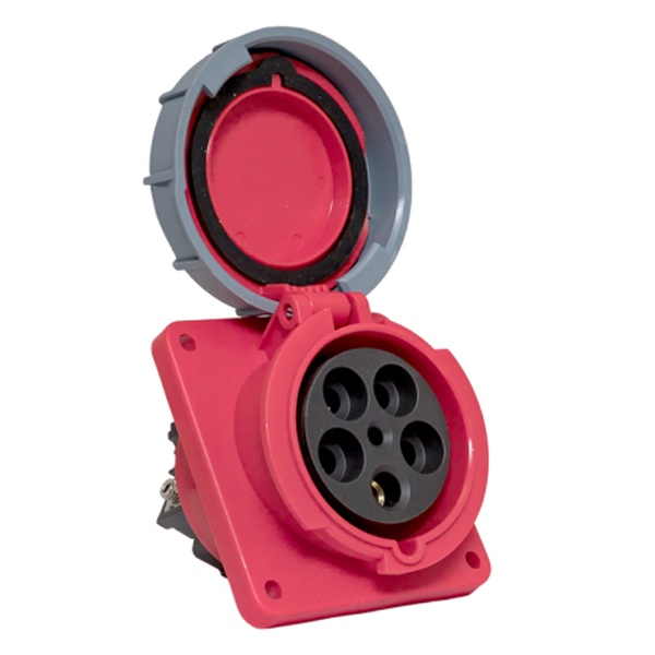 Влагозащищенная панельная встраиваемая силовая трехфазная розетка красного цвета с подключением под углом, 5 контактов, 400 Вольт 125А, Екф. ps-4452-125-380