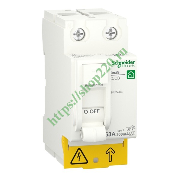 Устройство дифференциального тока селективного типа от компании Schneider Electric относится к линейке модульных агрегатов Resi9 и представляет собой защитное оборудование с отключающей способностью в 6 кА и чувствительностью 100 милиампер. Двухполюсный аппарат в белом корпусе шириной в 2 модуля создан для противопожарной защиты при возникновении тока утечки. Он относится к виду A-S и должен устанавливаться на вводе. Его главной особенностью выступает выдержка времени срабатывания в 40-130 мс на отключение. Благодаря временной задержке такой ВДТ обеспечивает селективность с нижестоящими выключателями дифференциального тока. Номинальный ток для самого аппарата составляет 63 Ампера при рабочем напряжении сети 230 Вольт переменного тока. Он крепится на DIN-рейку путем простого защелкивания и имеет универсальное рабочее положение. Подключение производится сверху или снизу с помощью медных жестких проводников с сечением до 35 мм2 или гибких с наконечниками до 25 мм2. На передней панели присутствует эргономичный рычаг управления с 2-мя положениями (I/O), а также тестовая кнопка для проверки работоспособности ВДТ. Желтая крышка отсека нижнего подключения предназначена для удобства присоединения кабелей и обслуживания.Параметры УЗО:ширина – 36 мм;высота – 81 мм;глубина – 78.5 мм;вес – 200 г.
