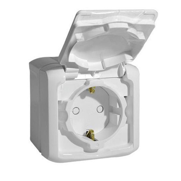 Розетка Schneider Electric РОНДО (открытой установки, цвет белый) с заземлением со шторками предназначена для сетей до 250 В на ток до 16 А.