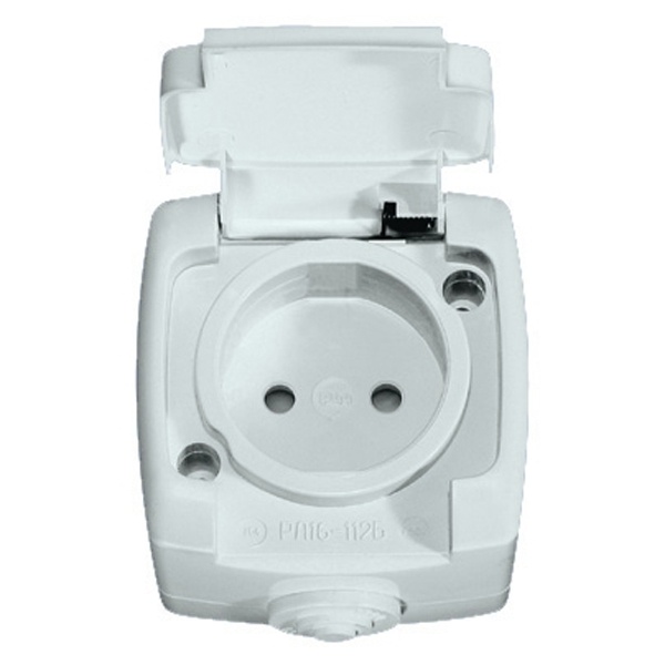 Влагозащищеная розетка (IP44) Шнайдер Электрик серии Рондо с заземляющим контактом, защитными шторками и защитной крышкой для внешней установки, мощностью 16 ампер, белого цвета RA16-112B-BI