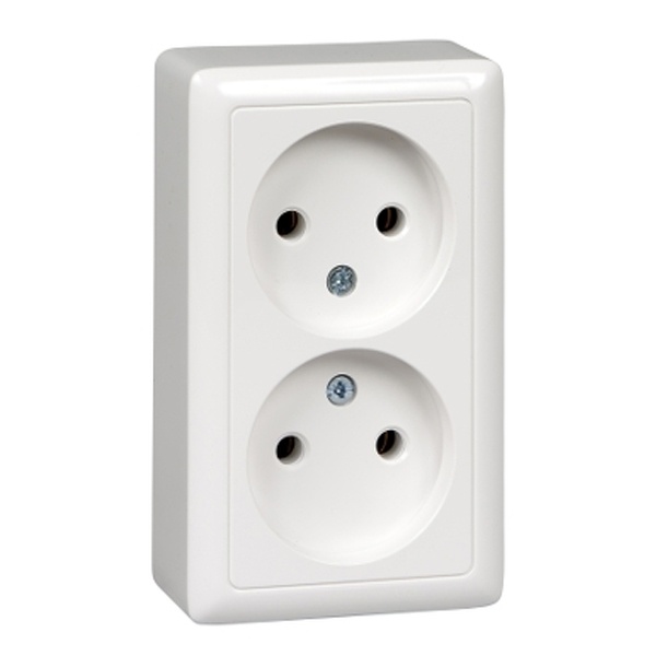Розетка Schneider Electric ХИТ (открытой установки, цвет белый) двойная без заземления и без шторок предназначена для сетей до 250 В на ток до 16 А.