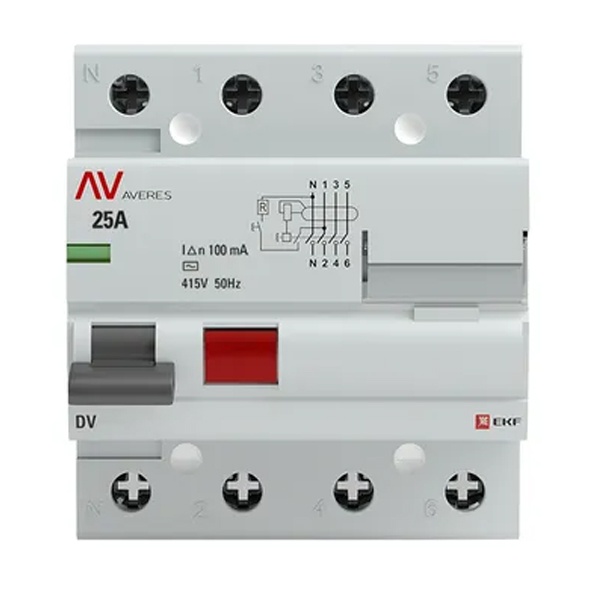 • Устройство защитного отключения УЗО EKF AVERES DV 4P 25А 100мА (электромеханическое) АС (ВДТ)