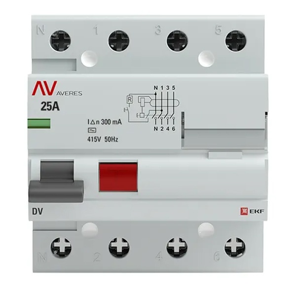 • Устройство защитного отключения УЗО EKF AVERES DV 4P 25А 300мА (электромеханическое) АС (ВДТ)