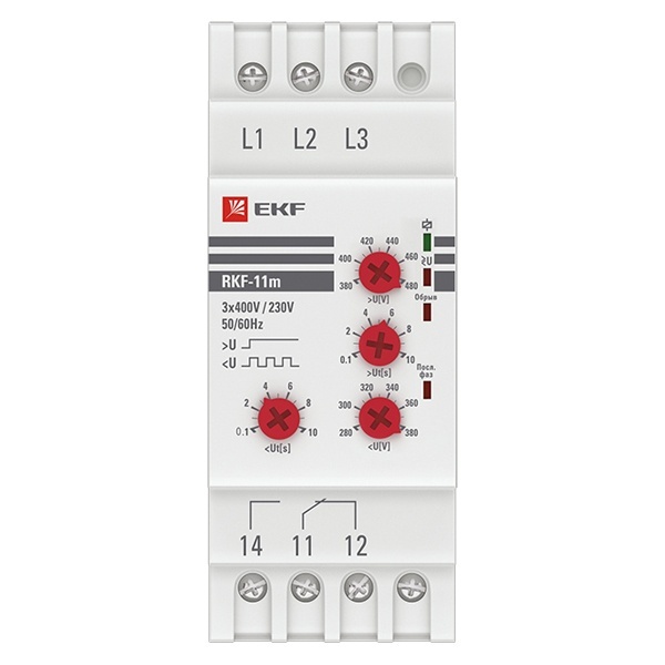 Многофункциональное реле контроля фаз RKF-11m EKF является микропроцессорным устройством, применяется в системах автоматизации и предназначено для контроля качества напряжения сети в электроустановках до 1000 В переменного тока трехфазной сети. Реле контролирует следующие параметры: