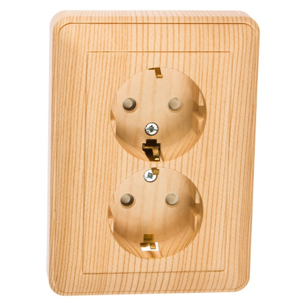 Электрическая розетка 2Р+Е с заземлением и интегрированными защитными шторками фирмы SE серии W59 применяется для скрытого монтажа в электрических сетях с максимальным током 16 Ампер и напряжением 250 Вольт. Она рассчитана на 2 подключения и используется в зданиях с проводкой с заземлением. Шторки осуществляют защитную функцию путем ограничения доступа к токоведущим контактам, при этом, не затрудняя подключение и извлечение вилки. Контактная группа изготовлена из высококачественной латуни, имеет высокую степень упругости и сохраняет плотный контакт с вилкой даже при длительной эксплуатации. Лицевая панель розетки выполнена из прочного глянцевого ABS-пластика с имитацией под дерево, который дополнит интерьер светлым оттенком соснового дерева. Главным отличием двойного механизма выступает полная комплектация с рамкой, в том же цвете, что является оптимальным и готовым решением для помещений. Материал устойчив к механическому воздействию и обладает электроизоляционными свойствами. Размеры двойной розетки: 118х85х50мм. Степень защиты изделия – IP20.