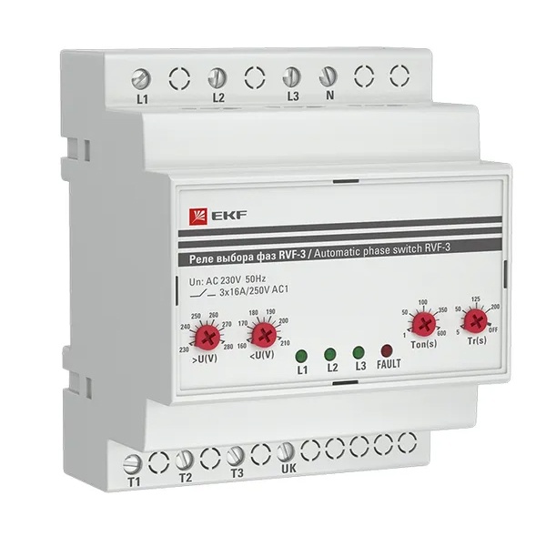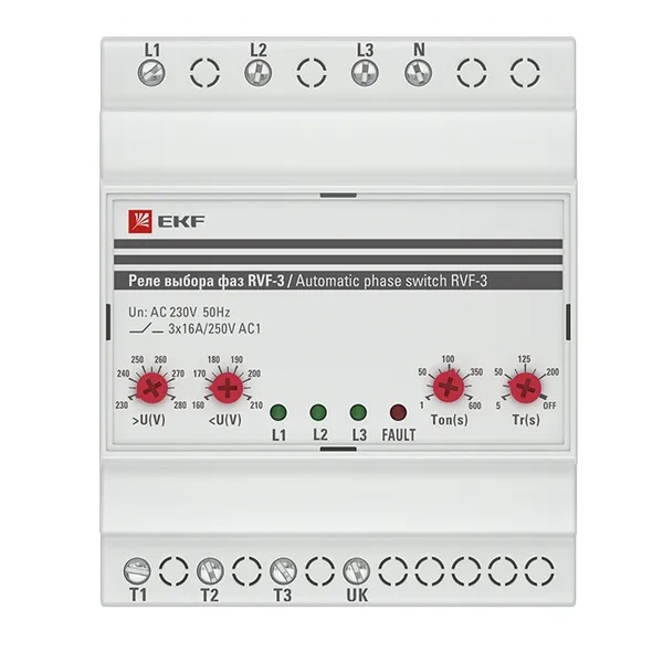 Реле выбора фаз RVF-3 EKF PROxima предназначено для обеспечения бесперебойного питания однофазных потребителей (230 В, 50/60 Гц) от трехфазной четырехпроводной или пятипроводной сети. Устройство автоматически выбирает наиболее качественное и стабильное фазное напряжение среди трех доступных фаз: L1, L2 и L3.