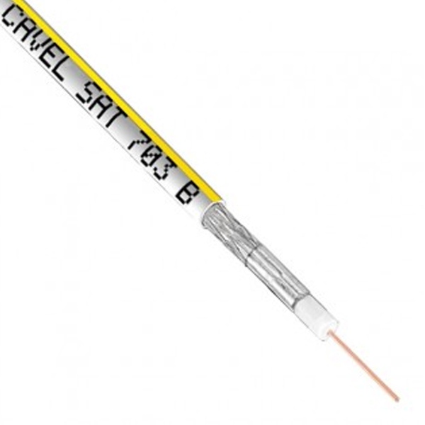 Этот коаксиальный кабель состоит из центрального проводника и двойного экрана, размещенных соосно. Внутренний одножильный проводник изготовлен из высококлассной меди и помещен в полиэтиленовый диэлектрик, способствующий сохранению соосного расположения проводников. Экран, наложенный на сердечник, имеет дополнительную плотную оплетку и благодаря этому надежно защищает передаваемый сигнал от внешних помех. Номинальное волновое сопротивление кабеля SAT 703B CAVEL– 75 Ом.