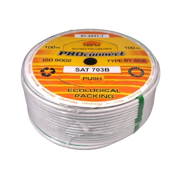 Кабель 703 производится из высококачественных материалов: центральная жила выполнена из меди, экран и оплетка — из алюминия. Коаксиальный кабель ProConnect соответствует установленным стандартам безопасности. Кабель используется для подключения эфирного, кабельного и спутникового телевидения. Благодаря малому затуханию сигнала он подходит для прокладки на большие расстояния. Медная токопроводящая жила придает кабелю гибкость, за счёт чего значительно упрощается его монтаж.