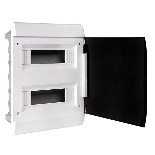 Особенностью щита является монтаж в специально подготовленную нишу в бетонной или кирпичной стене со следующими параметрами: 360х290х80 мм. Дверца бокса имеет реверсивный тип установки и затемненный вид. В комплект поставки входит 2 DIN-рейки, на которые производится установка устройств, а также набор шин N/PE, 2 планки, модульная наклейка и пузырьковый уровень. Подключение кабеля осуществляется снизу через основание, на котором имеется квадратная разметка с шагом 5 мм. Распределительный щит обладает эргономичным дизайном, удобен и практичен в эксплуатации. Он неприхотлив в обслуживании, поэтому отлично подходит для размещения как в жилом, так и промышленном секторе.