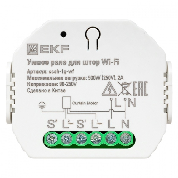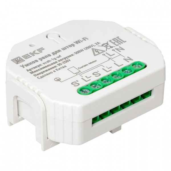 Умное реле скрытой установки для штор Wi-Fi EKF Connect предназначено для управления шторами с помощью смартфона. Умное реле предназначено для использования в сети с напряжением 230 В частотой 50 Гц.Для работы умного реле необходимо наличие беспроводной сети Wi-Fi с частотой 2,4 ГГц и выходом в сеть Интернет. Управление умным реле осуществляется с любого устройства на базе операционной системы Android 4.4 / IOS 8.0 или выше. Для управления необходимо установить приложение EKF Connect.