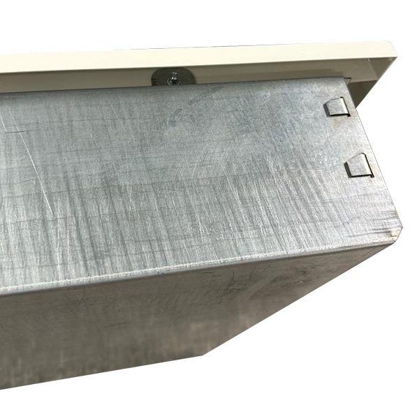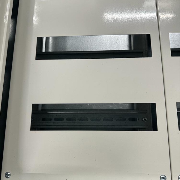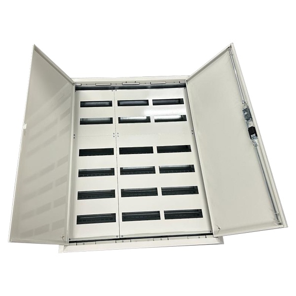 Этот распределительный щит соответствует стандартам EN 61439-1 и EN 61439-3, обеспечивая высокий уровень безопасности и соответствие требованиям. Корпус изготовлен из стали и окрашен порошковой краской. Крышка, также из стали, легко защелкивается и может поворачиваться на 90 градусов для удобства доступа.
