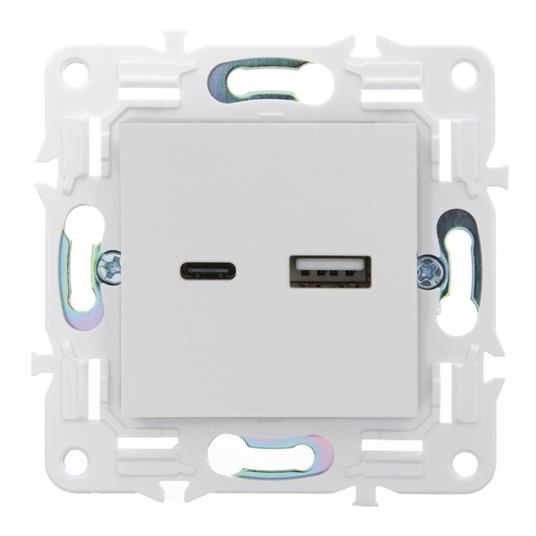 Розетка зарядная быстрая с двумя USB разъемами тип А и С, скрытого монтажа белого цвета SK-U22-018-K01