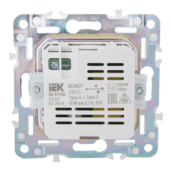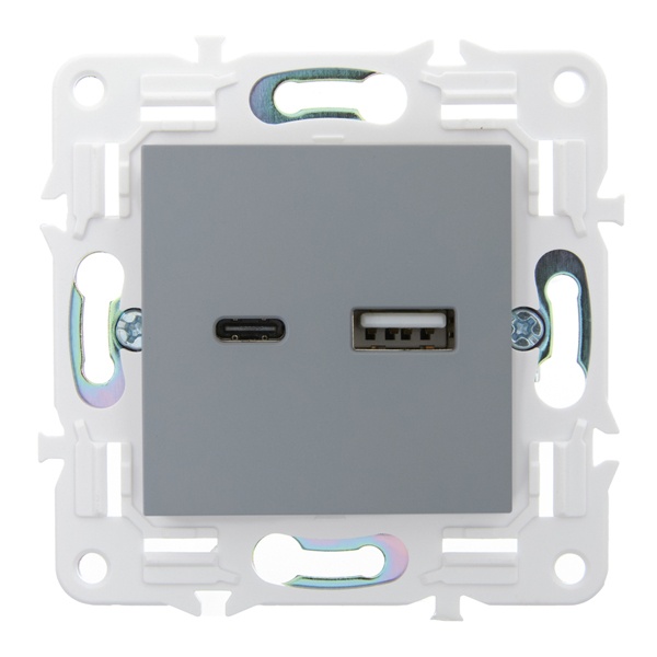 Розетка зарядная быстрая с двумя USB разъемами тип А и С, скрытого монтажа серого цвета SK-U22-018-K03