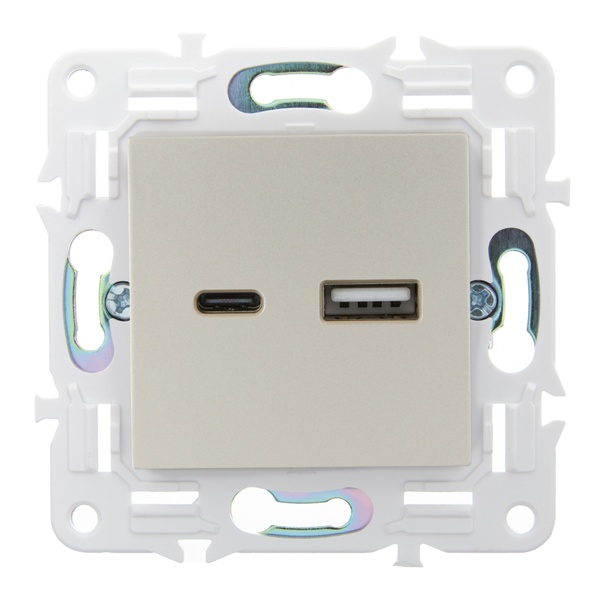 Розетка зарядная быстрая с двумя USB разъемами тип А и С, скрытого монтажа цвета шампань SK-U22-018-K37