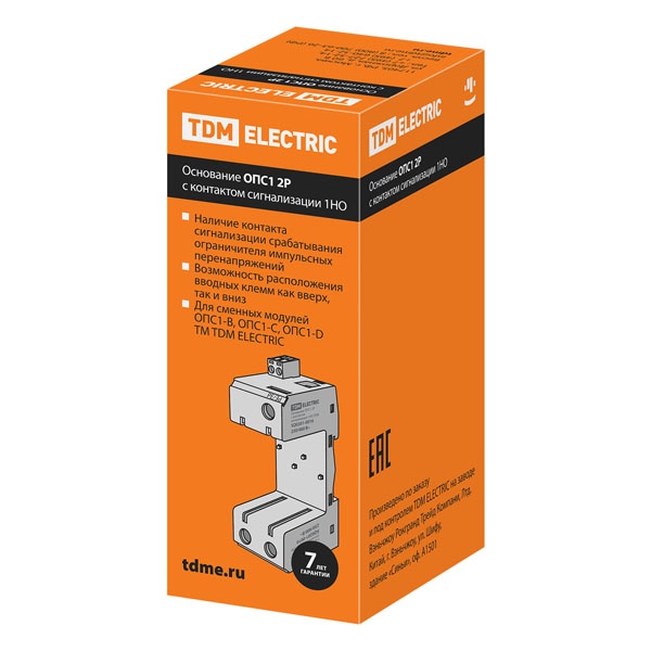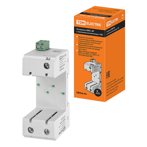 Назначение:что не требует постоянной проверки оборудования на месте его установки и значительно облегчает контроль за коммутационным оборудованием здания. Основание ОПС1 с контактом сигнализации является держателем сменного модуля ОПС1 TDM. предназначено для защиты внутренних распределительных цепей жилых и общественных зданий от грозовых и коммутационных импульсных перенапряжений. Применение:объекта до коммутационных и защитных аппаратов и счётчика. Преимущества:Любое рабочее положение в пространстве. Клеммные зажимы ограничителя промаркированы и подписаны (Сеть/Земля), что позволяет избежать ошибок при монтаже. Наличие контакта сигнализации срабатывания. Простота извлечения сменного модуля из основания ОПС-1 без съема с DIN-рейки. Совместимость размеров позволяет установить аппарат в стандартный щиток с любыми аппаратами модульной серии. Материалы:Корпус и детали аппарата выполнены из пластика, не поддерживающего горение. Упаковка:Основание ОПС1 2Р по 60 шт. Основание ОПС1 3Р по 40 шт. Основание ОПС1 4Р по 30 шт.