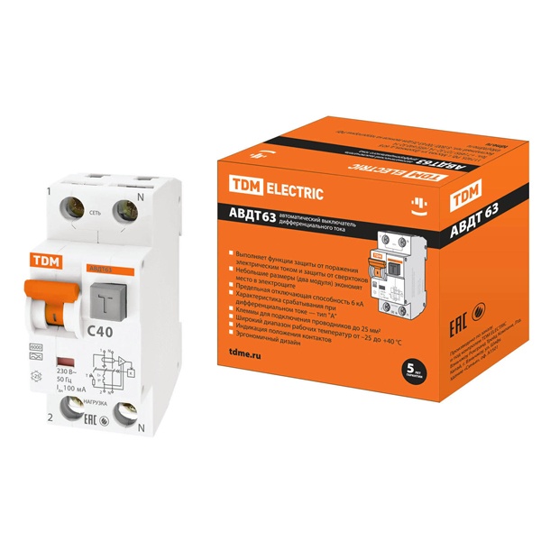 • Дифференциальный автомат TDM 1П+Н C40А 100мА тип А однофазный электронный 6кА АВДТ63 (дифавтомат, АВДТ)