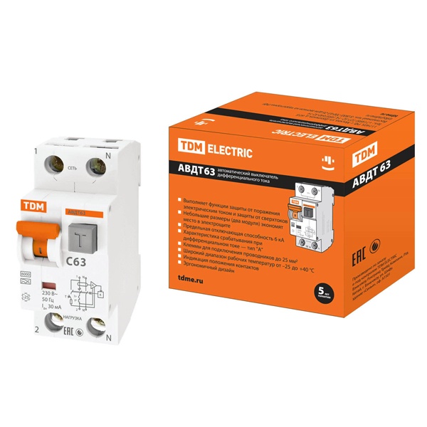 • Дифференциальный автомат TDM 1П+Н C63А 30мА тип А однофазный электронный 6кА АВДТ63 (дифавтомат, АВДТ)
