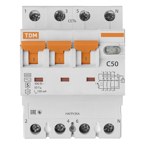 Четырехполюсный автоматический выключатель с селективной дифференциальной защитой 100 мА тип АС, ток нагрузки 50А, ПКС 6кА характеристика уставок С, ТДМ SQ0202-0048