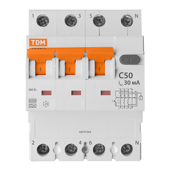 • Дифференциальный автомат TDM 4П(3П+Н) C50А 30мА тип А трехфазный электронный 6кА АВДТ63 (дифавтомат, АВДТ)