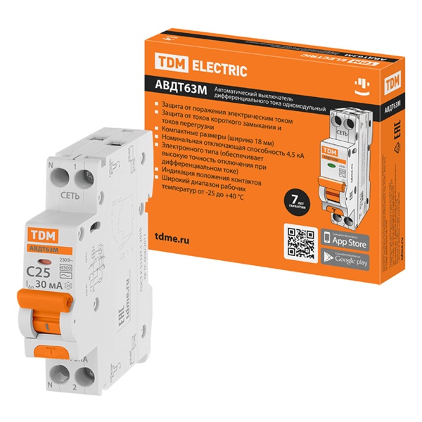 Назначение:Отключение тока при коротких замыканиях или перегрузке. Проведение тока в нормальном режиме. Отключение тока при прикосновении человека к токоведущим частям электроустановок или протекании дифференциального (утечки) тока на землю. Применение:Групповые линии, питающие розетки наружной установки. Преимущества:Компактная ширина модуля (18 мм) позволяет экономить место в элеткрощитах по сравнению со стандартной шириной АВДТ63 (36 мм). Сочетает в себе функции автоматического выключателя и выключателя дифференциального тока. Наличие индикации срабатывания от дифференциального тока утечки. Наличие шести заклепок позволяет усилить конструкцию аппарата и предотвратить деформацию корпуса при затягивании клеммных винтов. Материалы:Корпус и детали выполнены из пластика, не поддерживающего горение. Упаковка:АВДТ63М - 1 шт; Индивидуальная упаковка - 1 шт; Руководство по эксплуатации - 1 шт; Паспорт - 1 шт.
