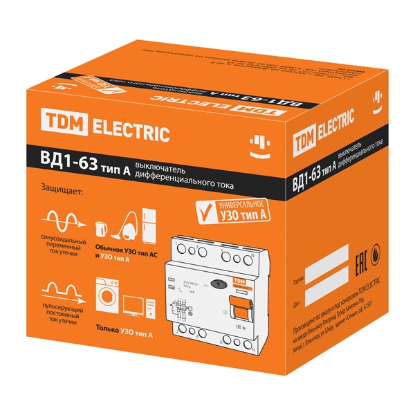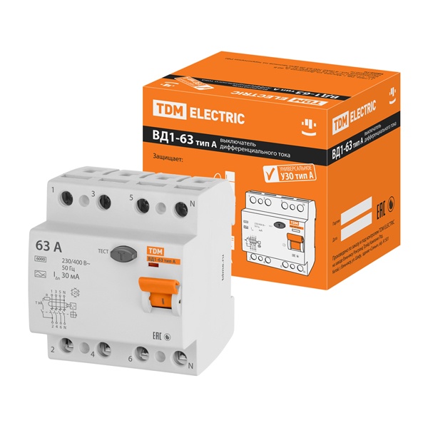 • Устройство защитного отключения TDM ВД1-63 4Р 63А 30мА тип А