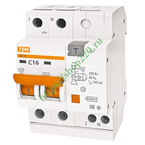 Дифференциальный автомат АД12 2Р С16А 100мА тип АС TDM 3,5 модуля (дифавтомат, АВДТ)