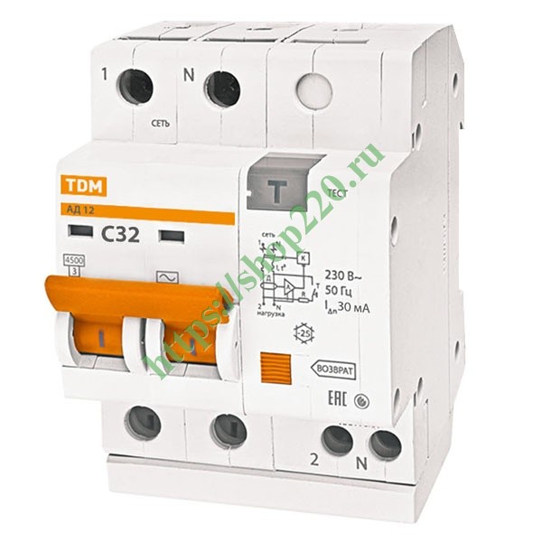 Дифференциальный автомат АД12 2Р С32А 30мА тип АС TDM 3,5 модуля (дифавтомат, АВДТ)
