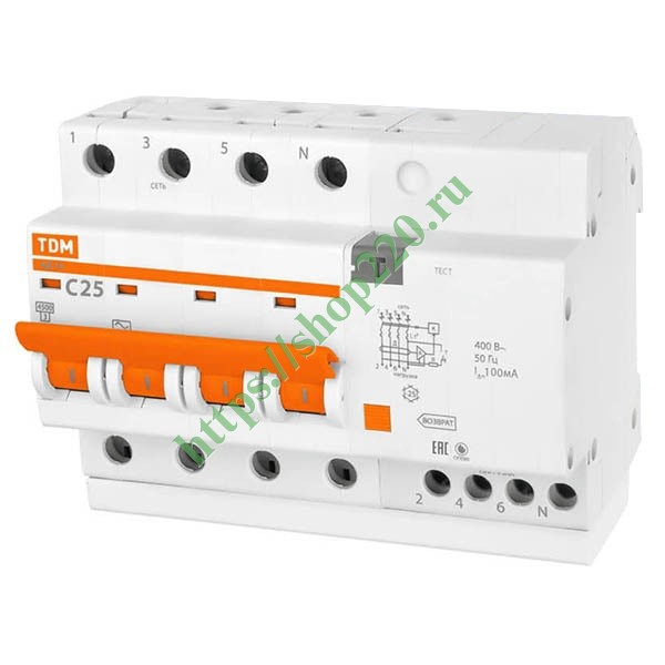 Дифференциальный автомат АД14 4Р С25А 100мА тип АС TDM 6,5 модуля (дифавтомат, АВДТ)