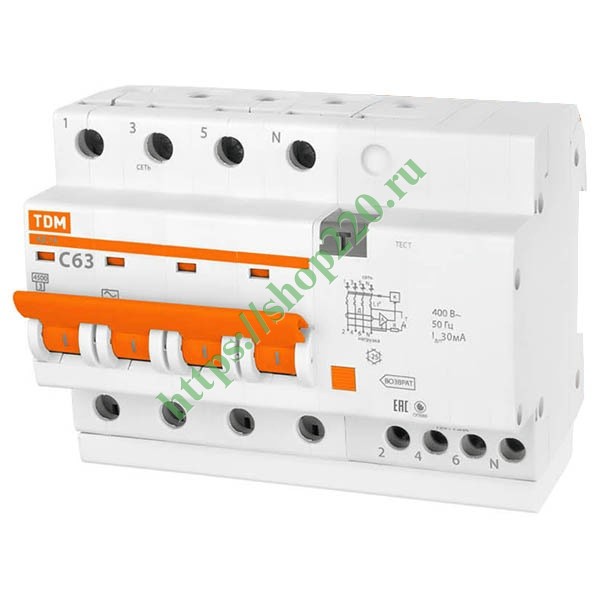 Дифференциальный автомат АД14 4Р С63А 30мА тип АС TDM 6,5 модуля (дифавтомат, АВДТ)