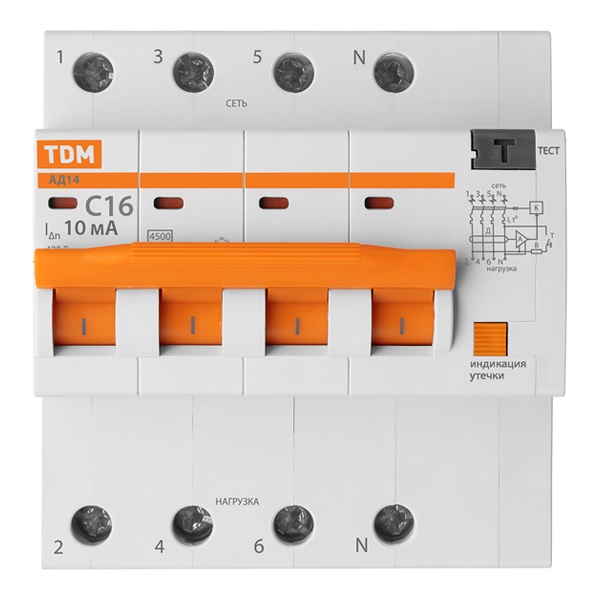 • Дифференциальный автомат TDM 4П С16А 10мА тип АС трехфазный электронный 4,5кА АД14 (дифавтомат, АВДТ)