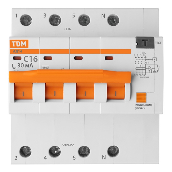 • Дифференциальный автомат TDM 4П С16А 30мА тип АС трехфазный электронный 4,5кА АД14 (дифавтомат, АВДТ)