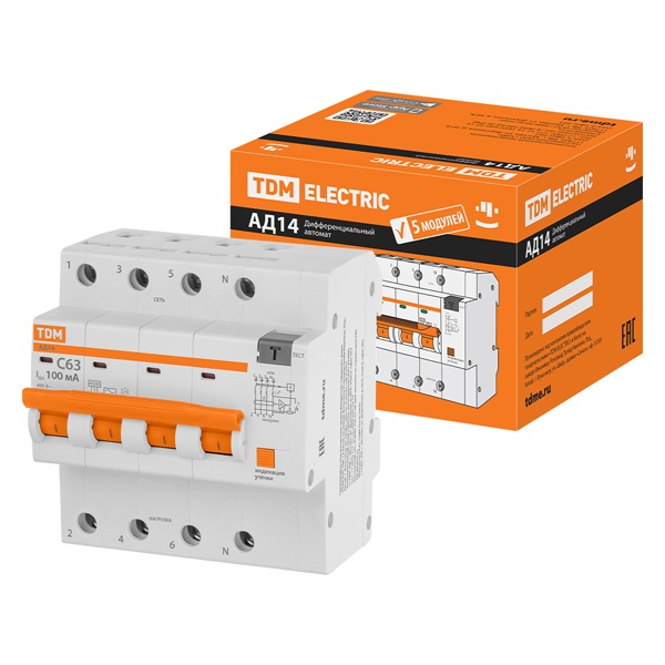 Четырехполюсный дифавтомат АД14 ТДМ, номинальный ток 63 ампера уставка С, дифференциальный ток 100 мА, шириной 5 модулей SQ0204-0146