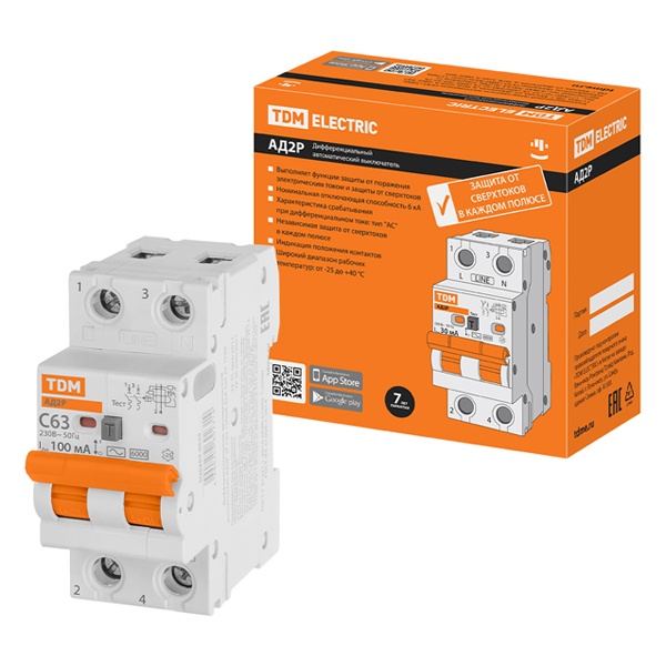 Дифференциальный автомат TDM АД2P 2Р С63А 100мА тип АС однофазный электронный 6кА АД2P (дифавтомат, АВДТ) SQ0204-0625