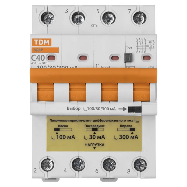 Четырехполюсный модульный автоматический выключатель 40А с регулируемой защитой от дифференциального тока 30/100/300мА тип АС, отключающая способность 6кА, уставка С, ТДМ АД4Р SQ0204-0633