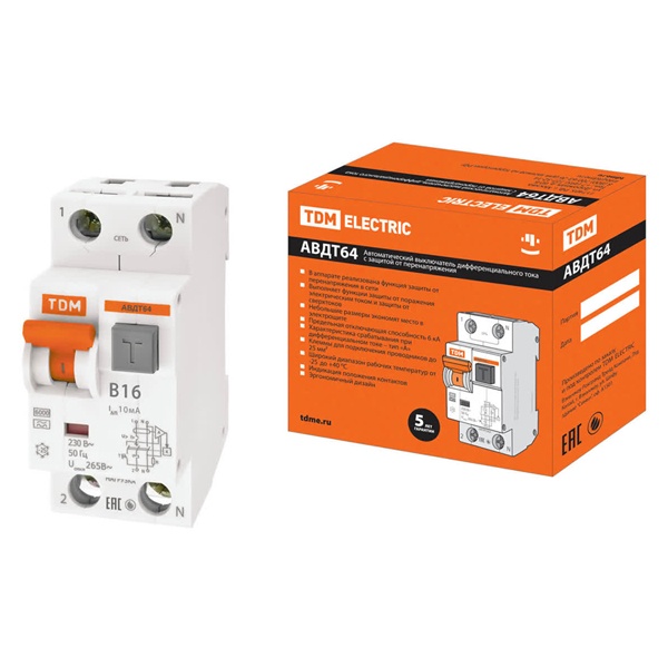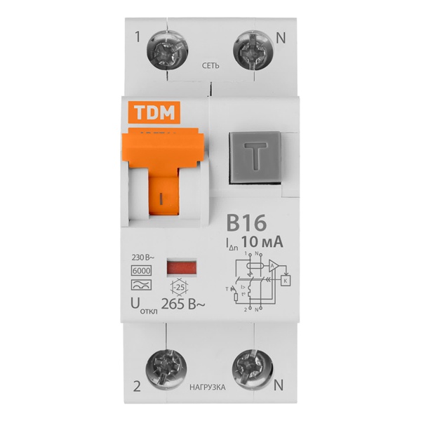 • Дифференциальный автомат TDM АВДТ64 1П+Н B16А 10мА тип А однофазный электронный 6кА (дифавтомат, АВДТ)