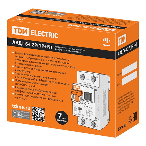 SQ0205-0001 Дифференциальный автомат TDM АВДТ64 1П+Н B16А 10мА тип А однофазный электронный 6кА (дифавтомат, АВДТ) фото 7