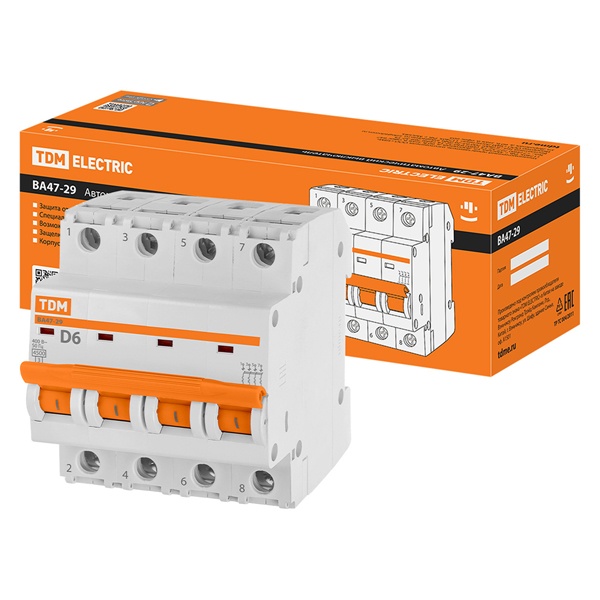 Назначение:Проведение тока в нормальном режиме. Отключение тока при протекании токов утечки на землю. Оперативное включение и выключение электрических цепей. Применение:Вводно-распределительные устройства для жилых и общественных зданий. Преимущества:Геометрия боковых поверхностей изделия разработана для улучшения теплового режима работы. На лицевой панели реализован механический индикатор положения контактов (включено/отключено), Возможность пломбирования для защиты от несанкционированного доступа (заглушка поставляется отдельно). Наличие двойного одновременного подключения. Шина и проводник значительно расширяет диапазон возможных схемных решений. Ширина модуля 17,5 мм. Материалы:Корпус и детали аппарата выполнены из пластика, не поддерживающего горение. Упаковка:Групповая упаковка ВА47- 29 1Р по 12 шт. ВА47-29 2Р по 6 шт. ВА47-29 3Р по 4 шт. ВА47-29 4Р по 3 шт. Руководство по эксплуатации - 1 шт. на групповую упаковку Паспорт - 1 шт. на групповую упаковку