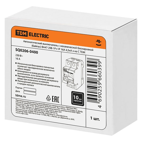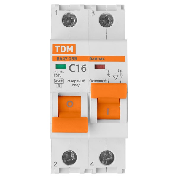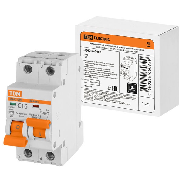Двухмодульный автоматический выключатель с основным и резервным вводом, механическая блокировка, ток нагрузки 16А, ПКС 4500А, ТДМ SQ0206-0400