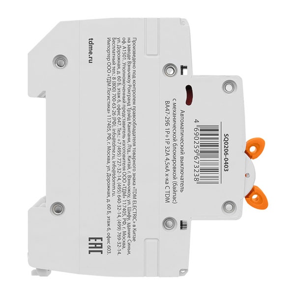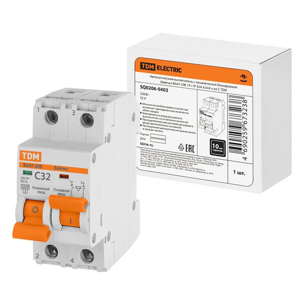 Двухмодульный автоматический выключатель с основным и резервным вводом, механическая блокировка, ток нагрузки 32А, ПКС 4500А, ТДМ SQ0206-0403